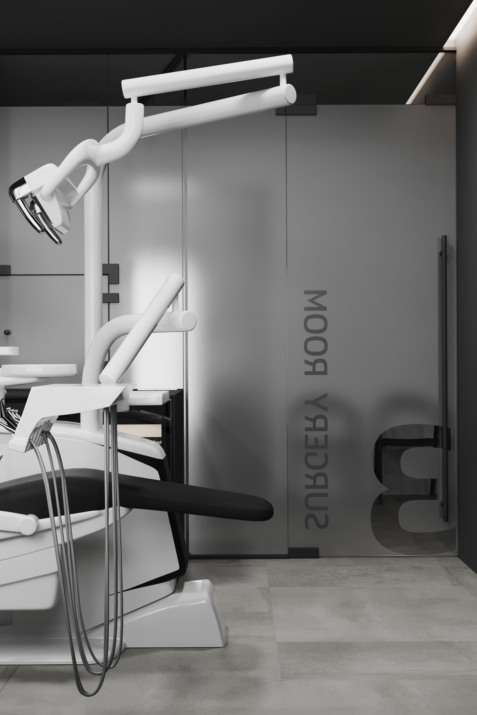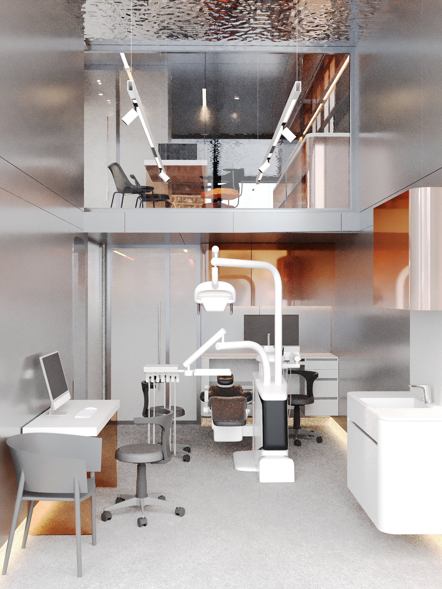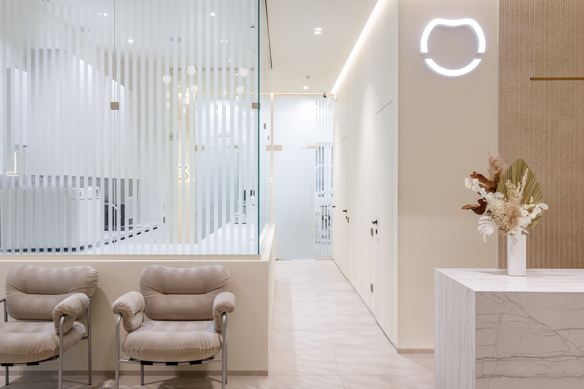 Изначально планировалось разместить 5 стоматологических кресел. Но было принято решение отказаться от одного кресла в пользу создания просторного холла и зоны ожидания. Это решение позволило уйти от ощущения «конвейера» и тесноты, сохранив статус бутиковой клиники.