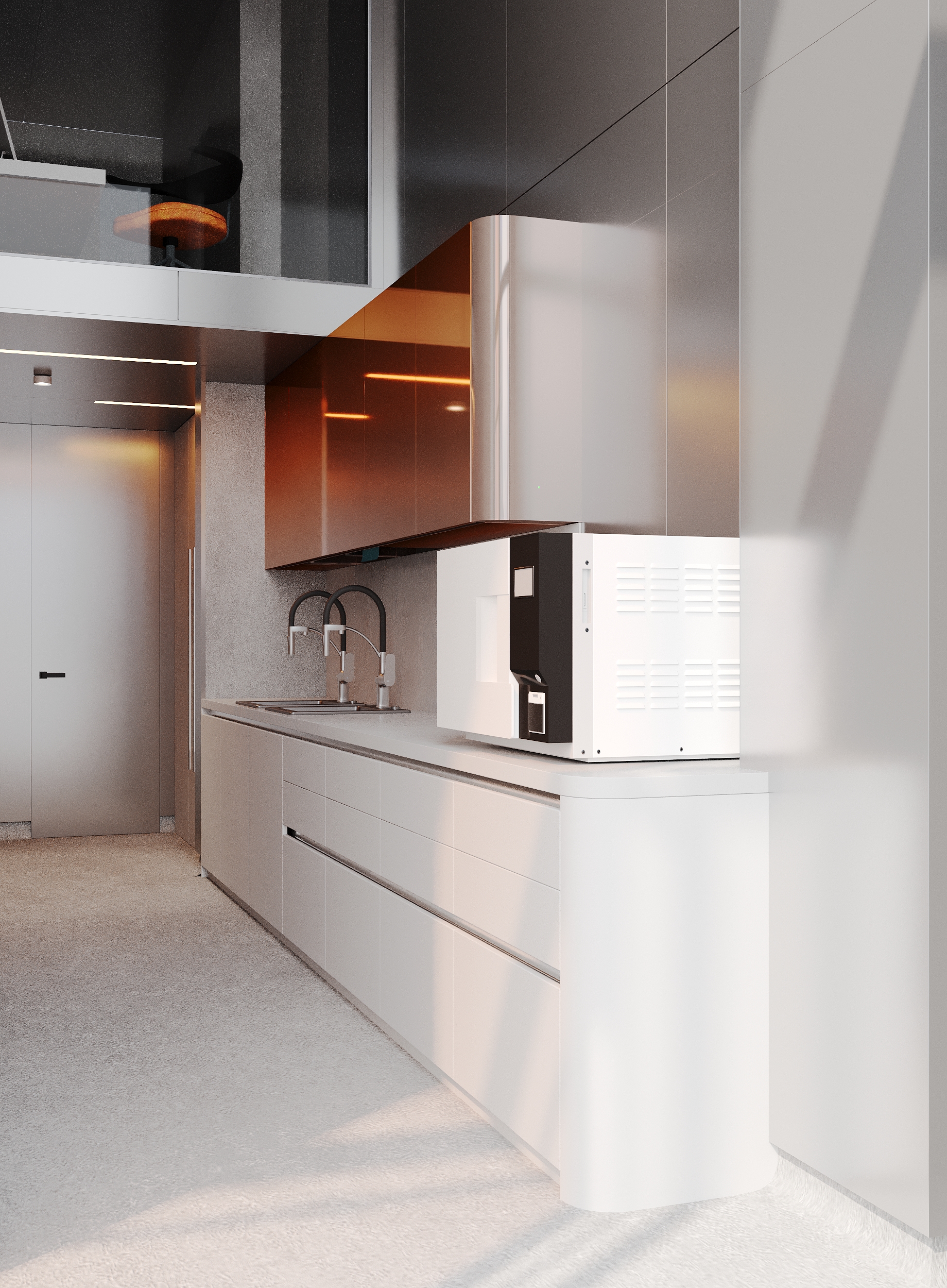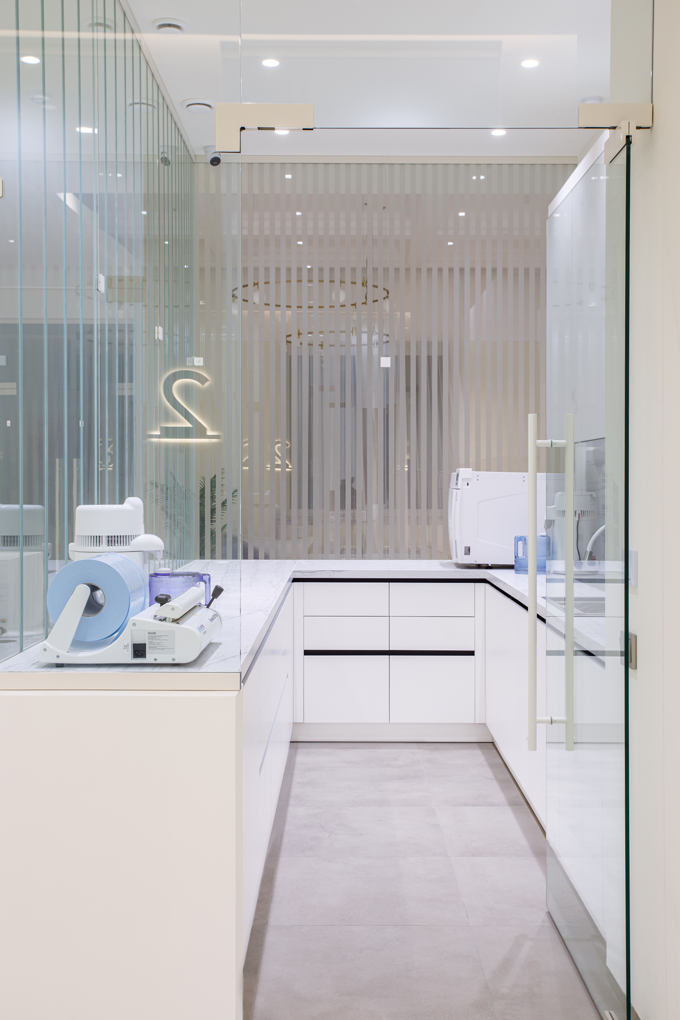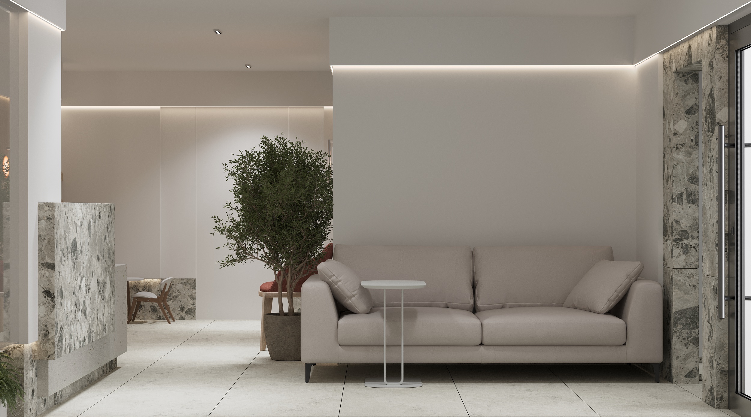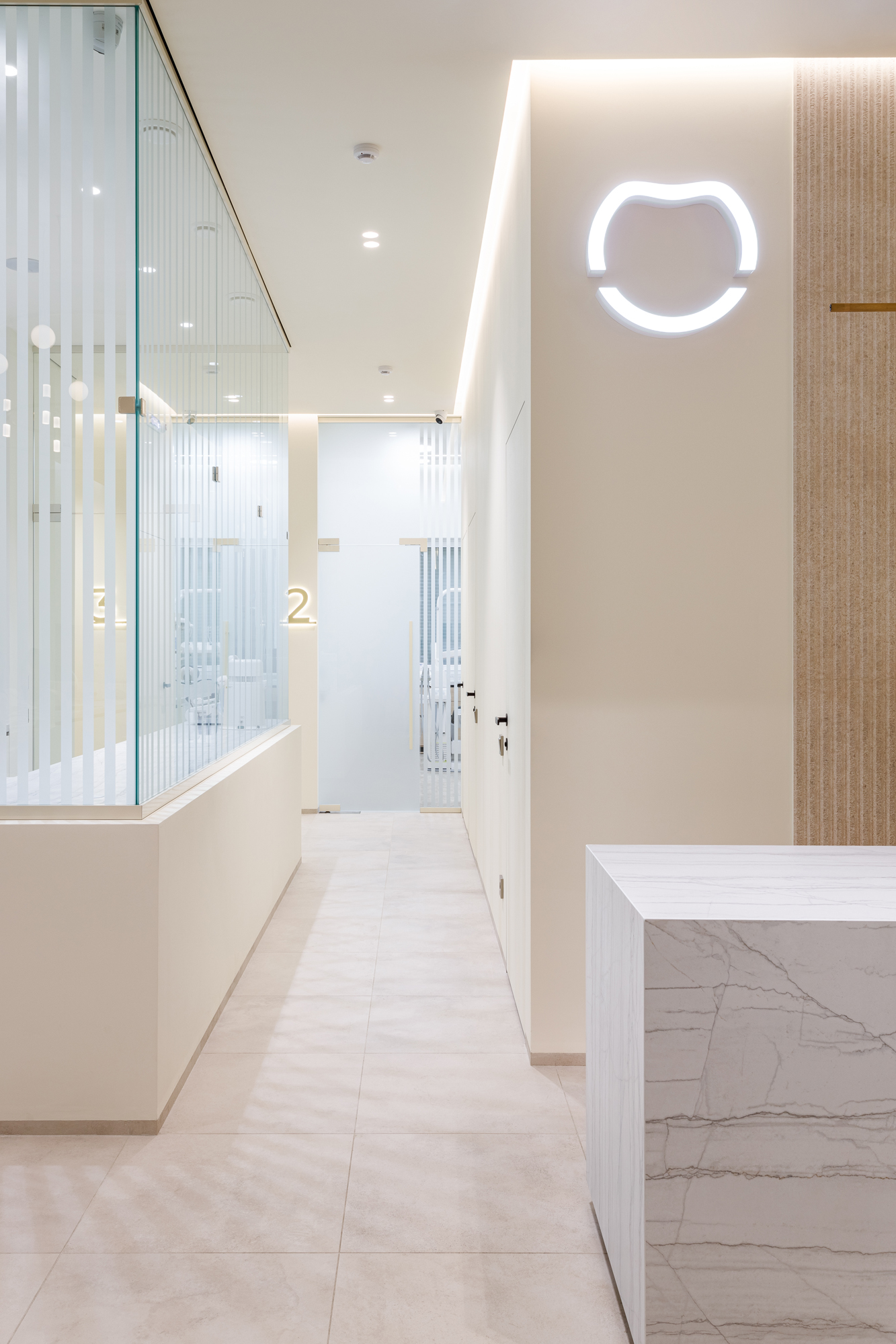 Изначально планировалось разместить 5 стоматологических кресел. Но было принято решение отказаться от одного кресла в пользу создания просторного холла и зоны ожидания. Это решение позволило уйти от ощущения «конвейера» и тесноты, сохранив статус бутиковой клиники.