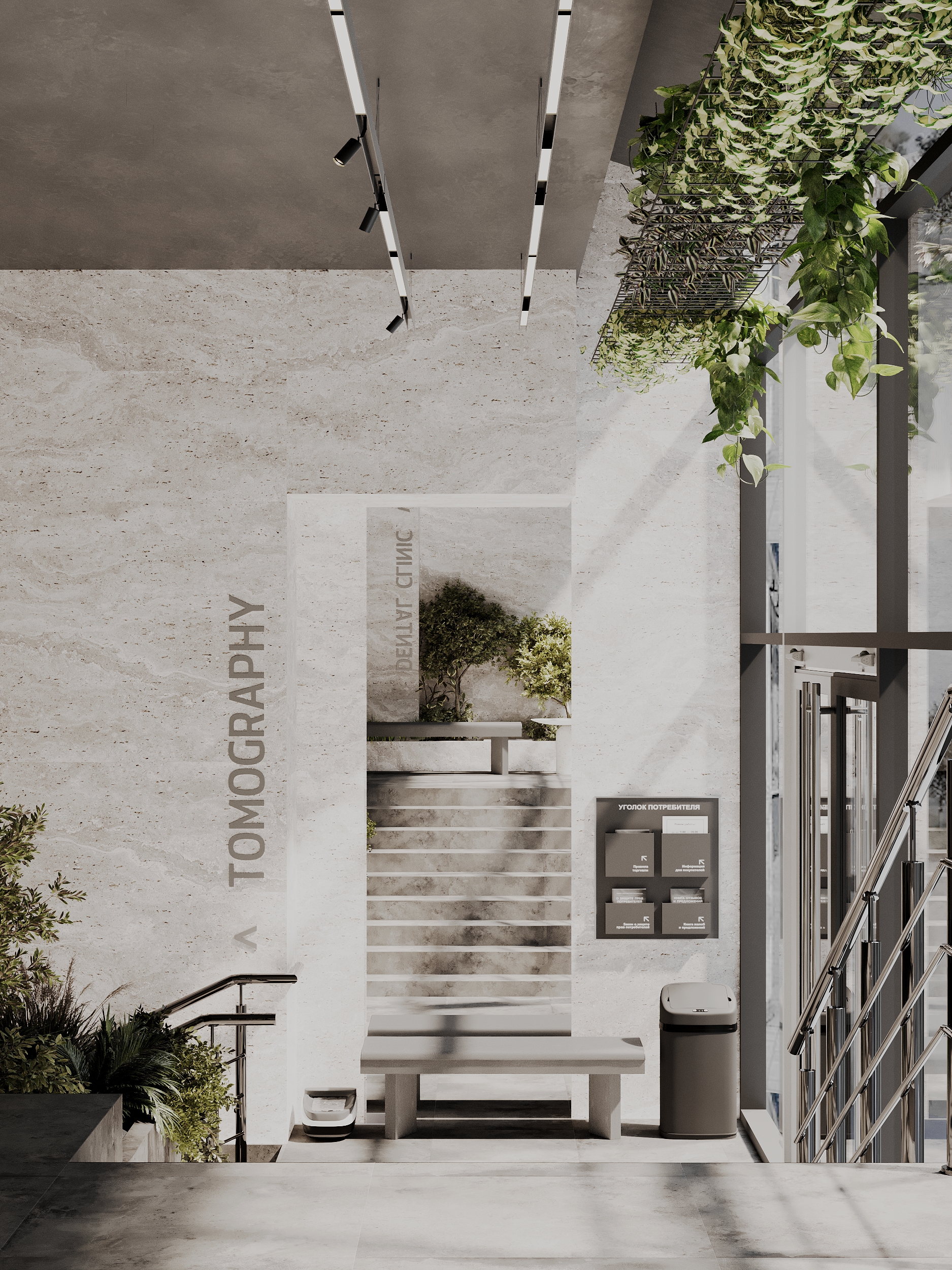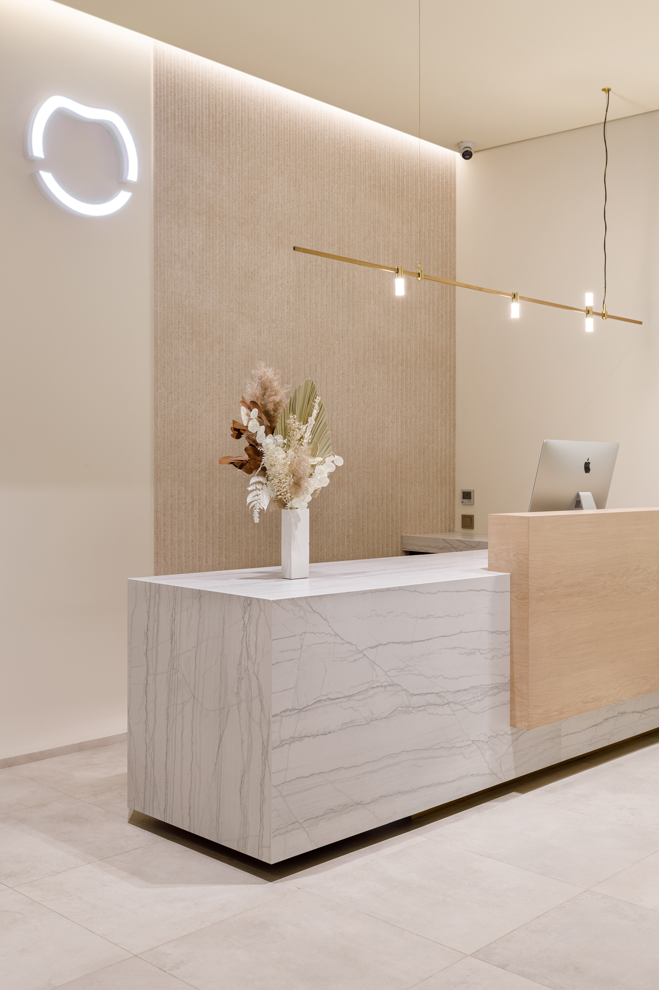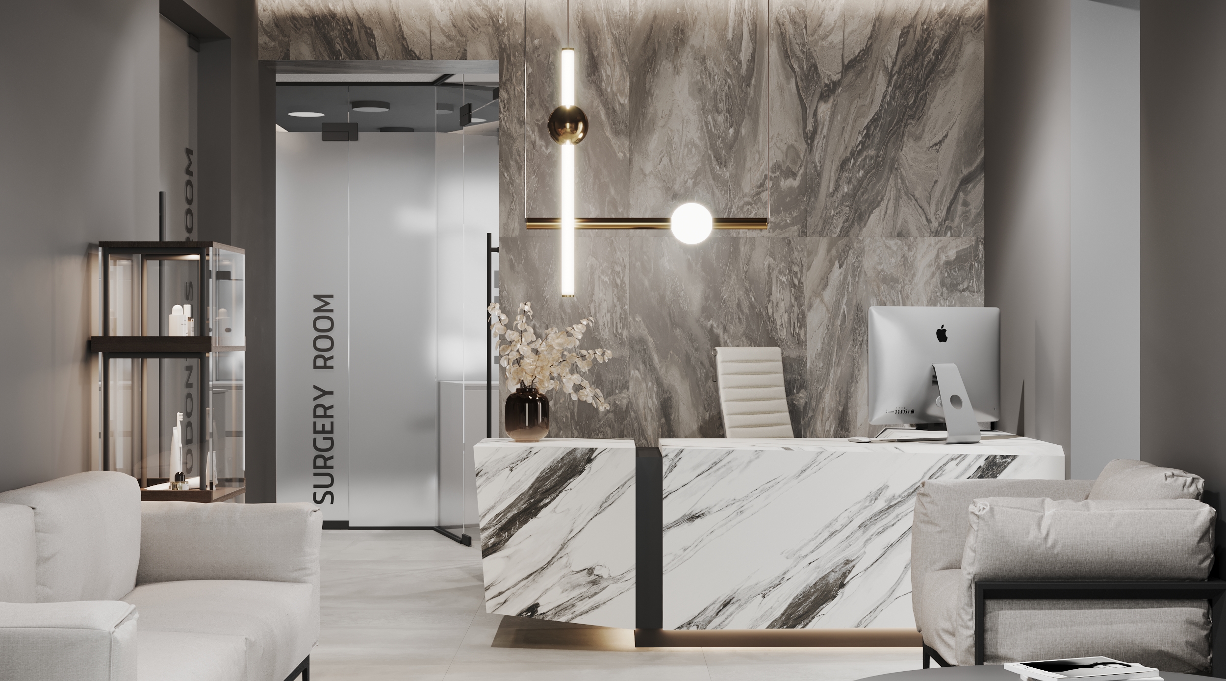 Уникальный дизайн с акцентом на клиентский опыт: парящий камень на ресепшн, видимая стерилизация, окно передачи инструментов.