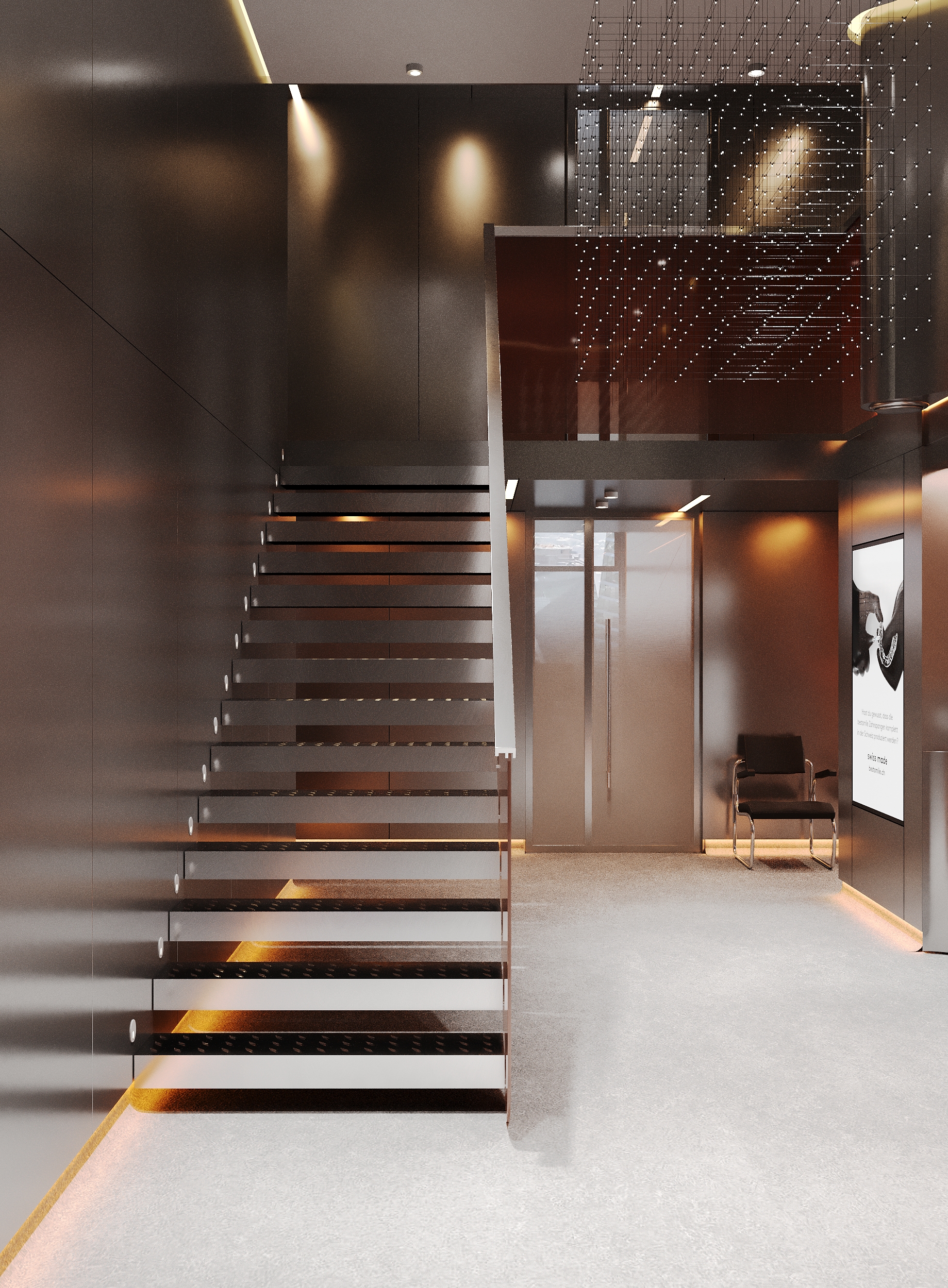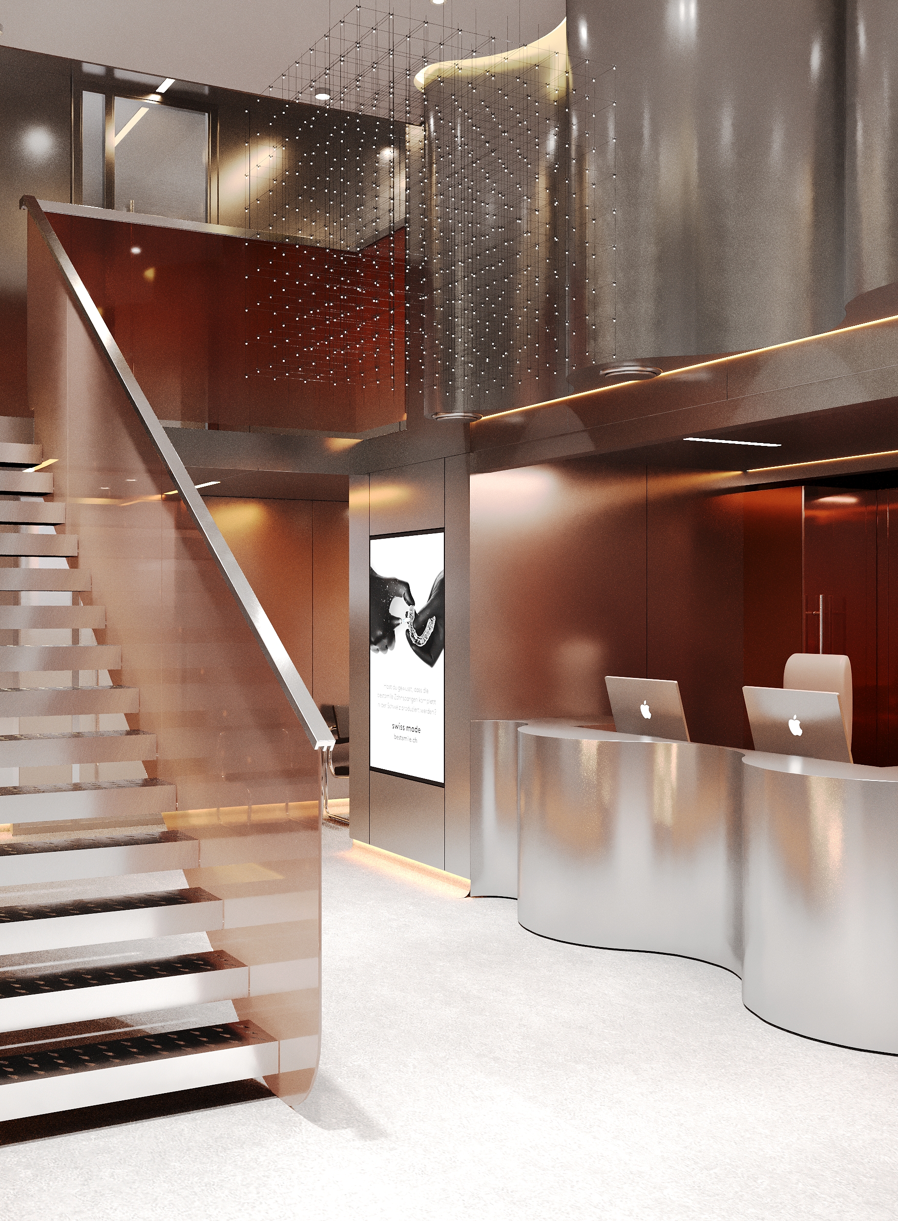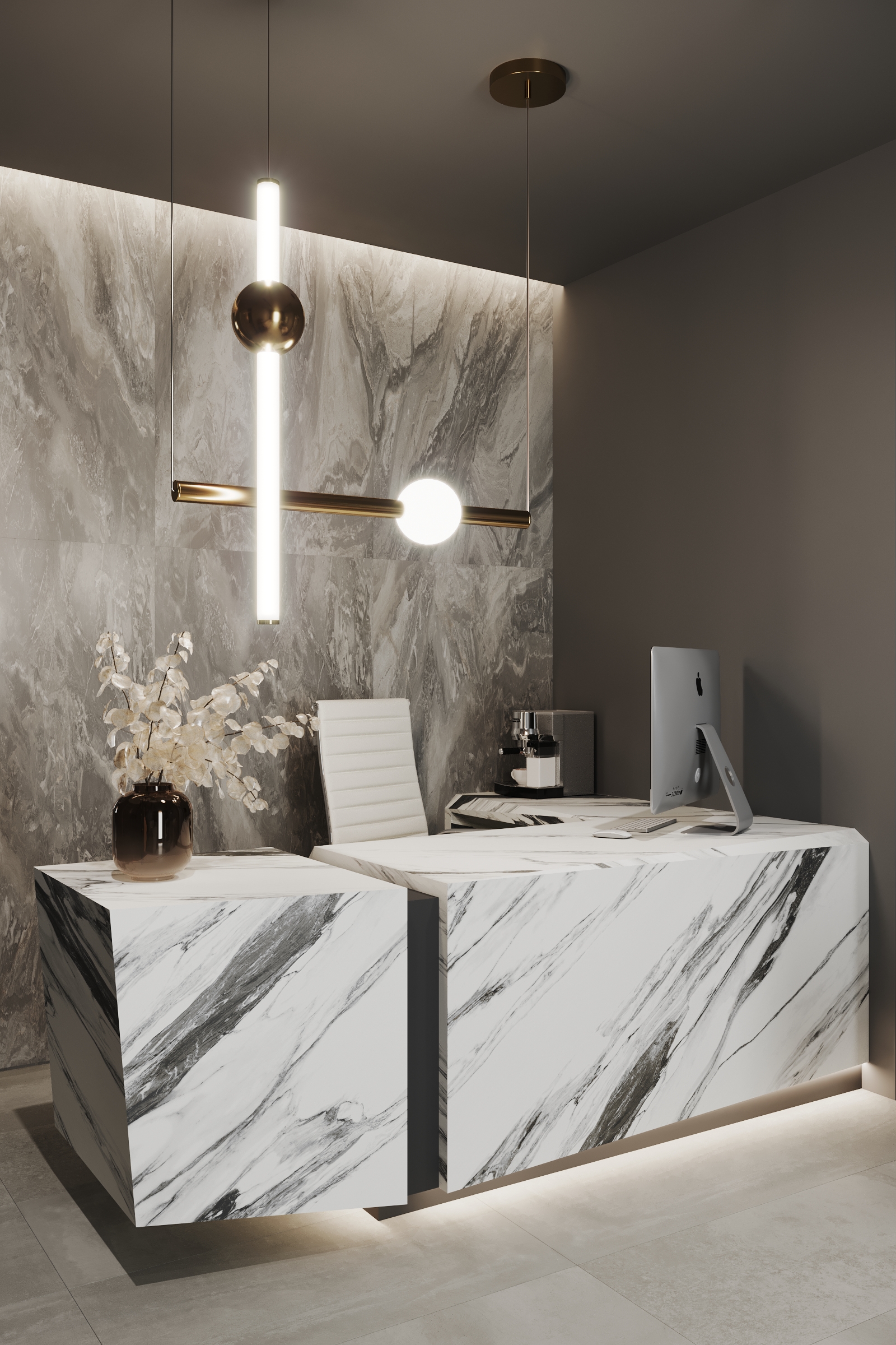 Уникальный дизайн с акцентом на клиентский опыт: парящий камень на ресепшн, видимая стерилизация, окно передачи инструментов.
